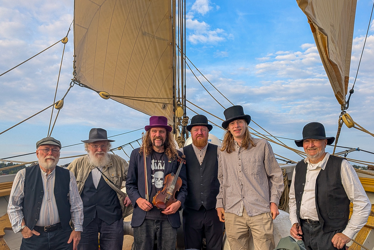 Ombord har vi långväga besök av folkmusikerna i the Brisk Young Ploughboys. De säger själva att de sjunger fler låtar om att plöja åkrar än att skrubba däck, men vi vill tro att de är gamla sjömän som helst sjunger om längtan hem. De bjuder oss på en härlig blandning av traditionell engelsk folkmusik.